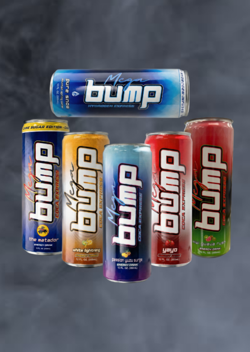 Unleash Vibrant Energy with Mega Bump Energy Drinks, Infused with ENACO-Sourced Atomized Coca Leaf Powder with Bold, Exotic Flavors you already love!